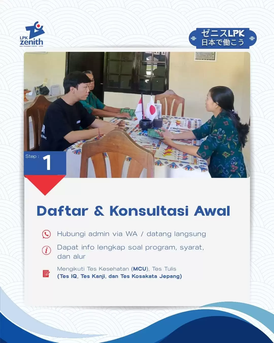 Langkah pertama adalah melakukan pendaftaran dan konsultasi awal. Kamu bisa langsung menghubungi admin melalui WhatsApp atau datang ke kantor LPK Zenith di Jasri, Karangasem. Pada tahap ini, kamu akan mendapatkan informasi lengkap mengenai program, persyaratan, serta alur keberangkatan. Selain itu, akan ada tes kesehatan (MCU) dan tes tulis yang meliputi IQ, tes kanji, serta kosakata bahasa Jepang.