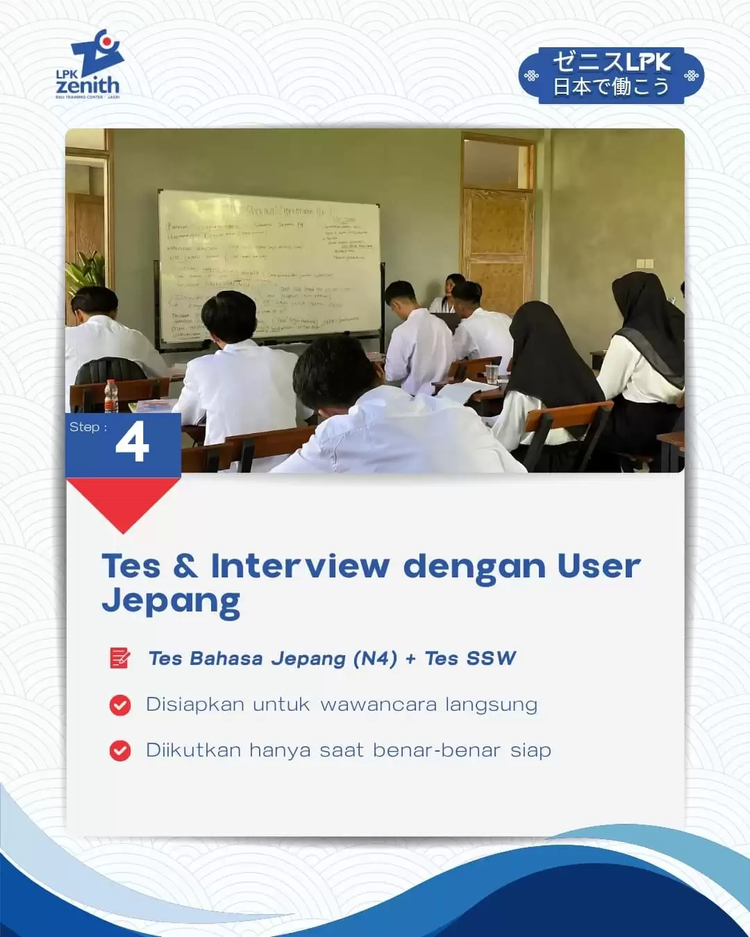 Setelah pelatihan, kamu akan mengikuti tes bahasa Jepang (N4) dan tes skill SSW sesuai bidang kerja yang dipilih. Hanya siswa yang benar-benar siap yang akan diikutkan pada tahap wawancara dengan user Jepang. LPK Zenith mempersiapkan siswanya agar percaya diri menghadapi interview, sehingga peluang diterima sangat besar.