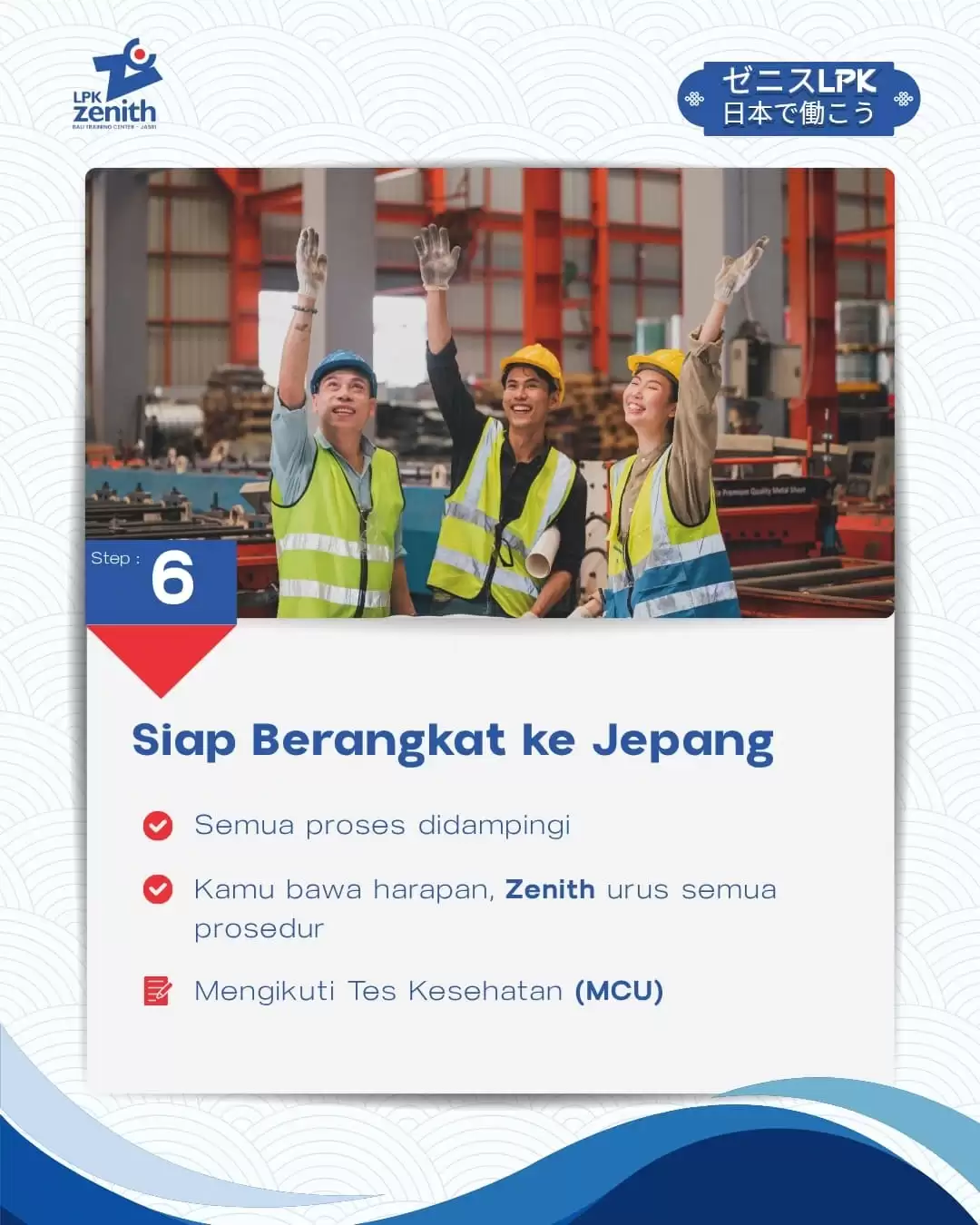 Tahap terakhir adalah persiapan keberangkatan. Kamu membawa harapan dan semangat, sementara semua proses teknis sudah diurus oleh LPK Zenith. Sebelum berangkat, siswa akan mengikuti tes kesehatan (MCU) terakhir untuk memastikan kondisi fit. Setelah itu, kamu siap terbang menuju Jepang dan memulai perjalanan baru dalam kariermu.