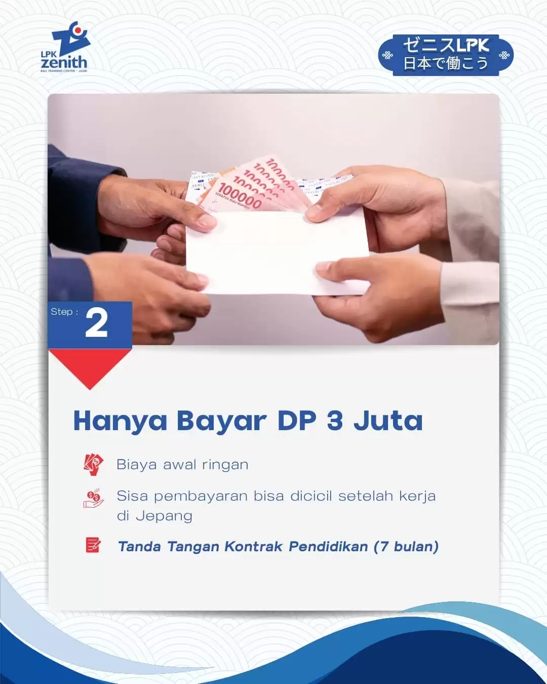 Banyak orang berpikir berangkat kerja ke Jepang butuh biaya puluhan juta di awal. Faktanya, di LPK Zenith kamu cukup membayar DP sebesar 3 juta rupiah. Biaya awal ini sangat ringan, sedangkan sisa pembayaran bisa dicicil setelah kamu sudah bekerja di Jepang. Pada tahap ini juga dilakukan penandatanganan kontrak pendidikan selama 7 bulan.